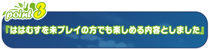 「前作『ははむす』をプレイしてなくても。全く、これっぽっちも問題なく楽しめる内容になっているから未プレイに人も安心していいわよ」